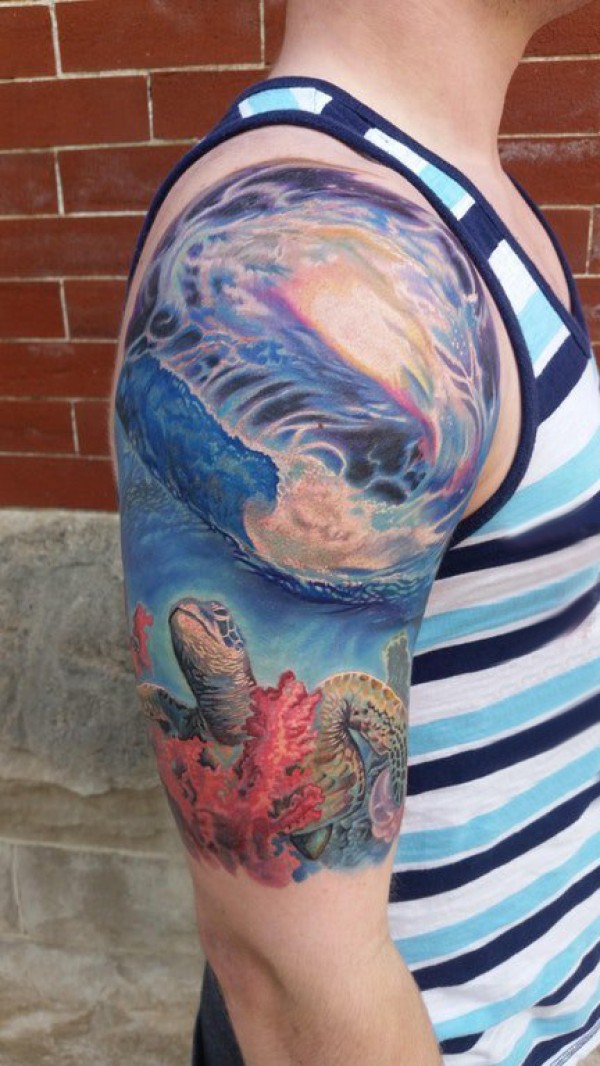 海洋纹身素材 男生大臂上彩色的海龟纹身图片