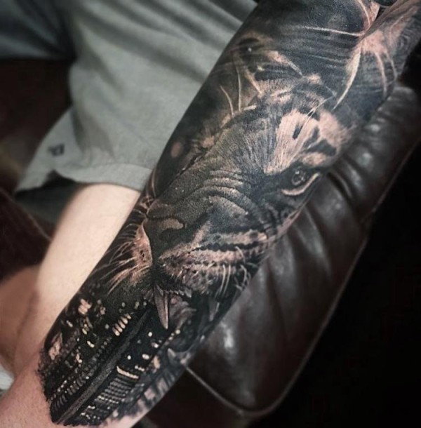 纹身黑色 男生手臂上黑色的老虎纹身图片
