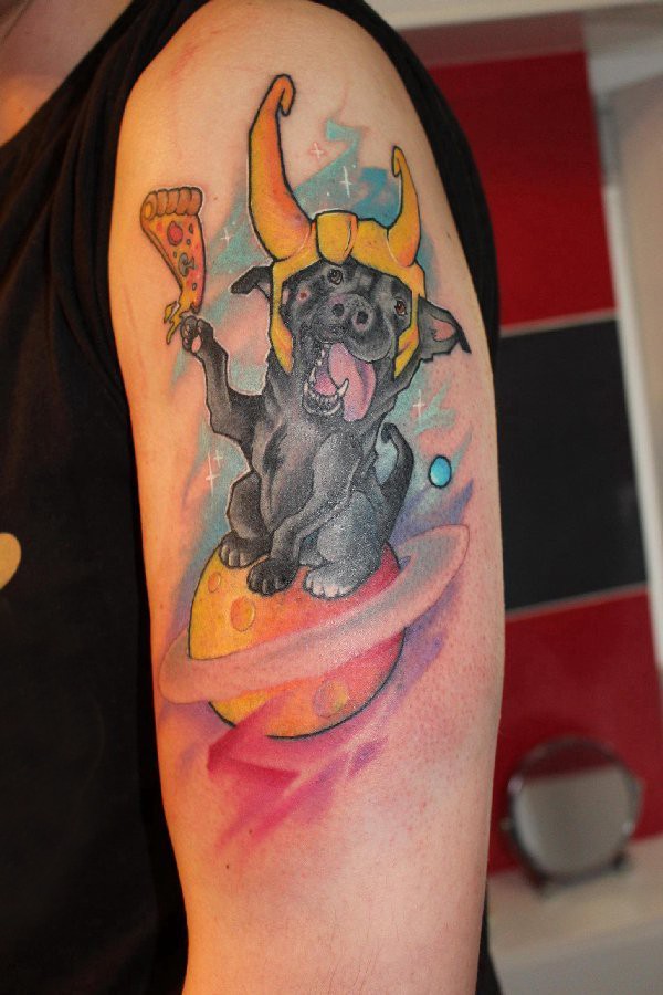 宠物狗纹身 男生手臂上彩色的宠物狗和星球纹身图片
