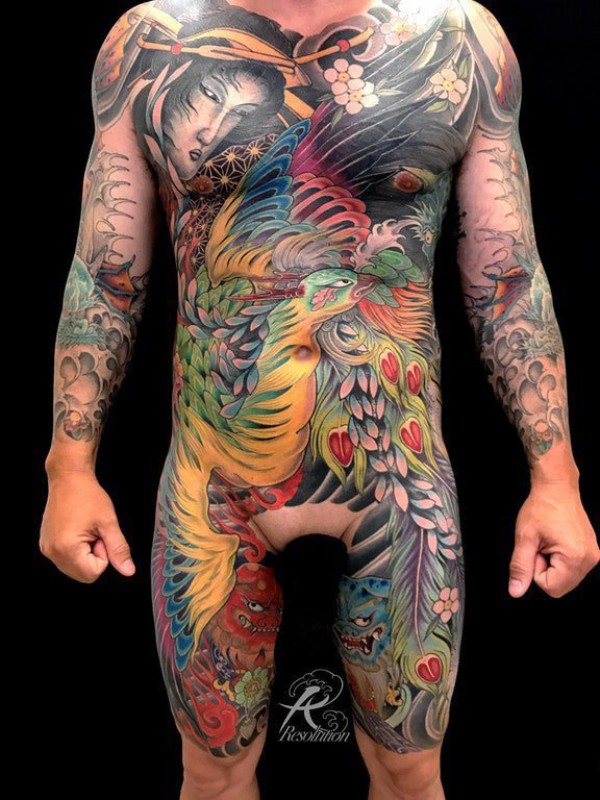 纹身全身图 男生全身彩色的人物和孔雀纹身图片
