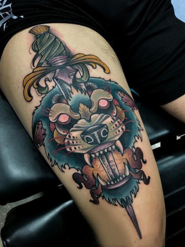 滴血狼头纹身 男生大腿上狼头和匕首纹身图片