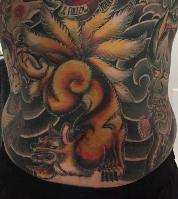 九尾狐狸纹身图片 男生腹部彩色的九尾狐狸纹身图片