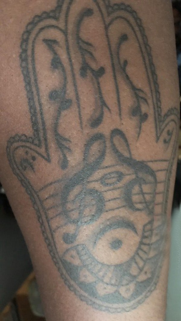 手掌小纹身 男生大腿上手掌和音符纹身图片