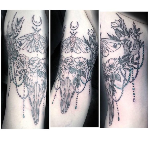 牛头骨纹身 男生大臂上黑灰的牛头骨纹身图片