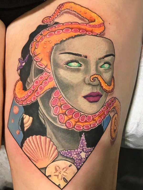 人物肖像纹身 女生大腿上创意的人物肖像纹身图片
