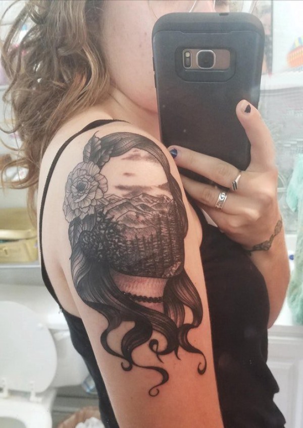 人物肖像纹身 女生大臂上黑灰的人物肖像纹身图片