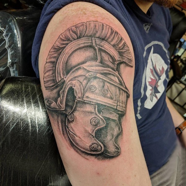 武士头盔纹身 男生大臂上黑灰的武士头盔纹身图片