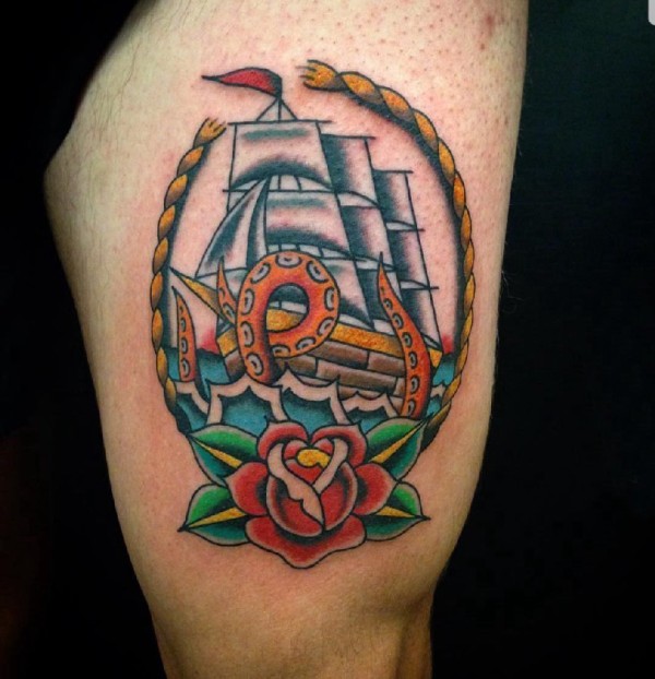 纹身小帆船 男生手臂上帆船和花朵纹身图片