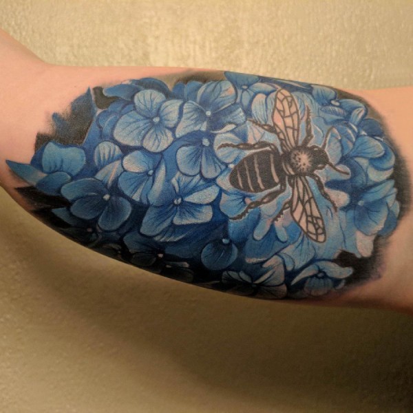 纹身图案花朵 男生大臂上彩色的花朵和蜜蜂纹身图片