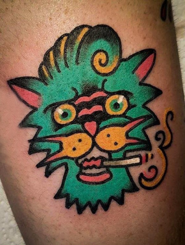 狮子头纹身图片 男生小腿上可爱的狮子头纹身图片