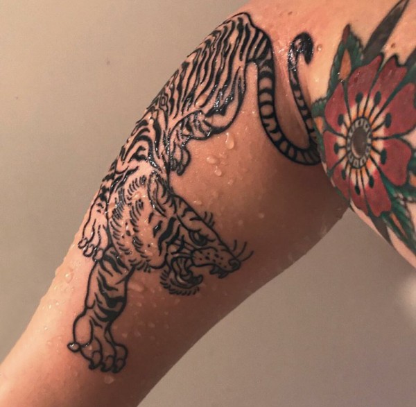 老虎和花朵纹身图案 男生手臂上老虎和花朵纹身图片