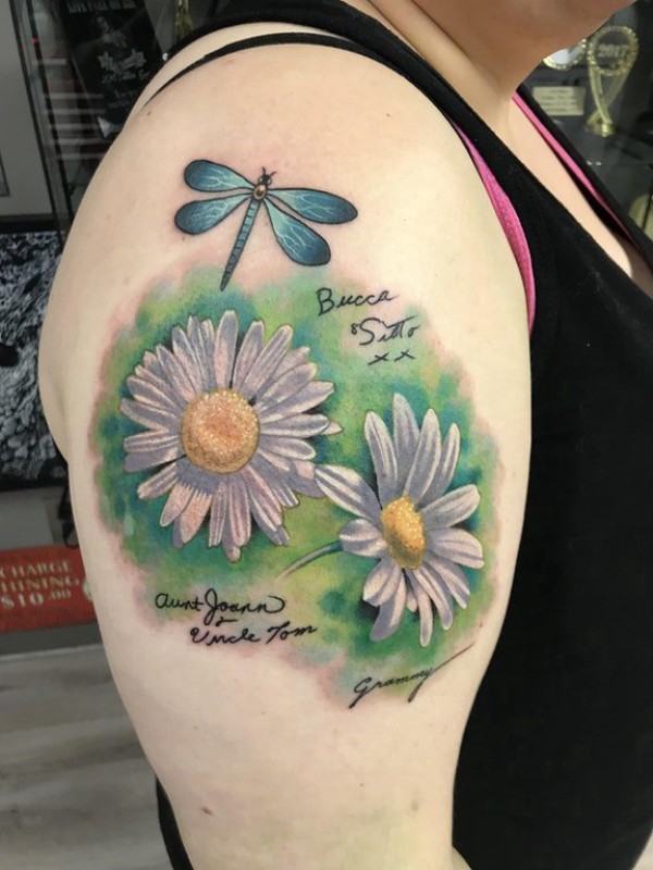 小清新植物纹身 女生大臂上蜻蜓和花朵纹身图片