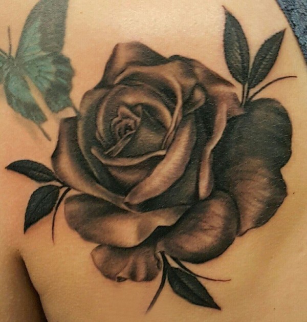 玫瑰纹身图 女生肩上彩绘玫瑰和蝴蝶纹身图片