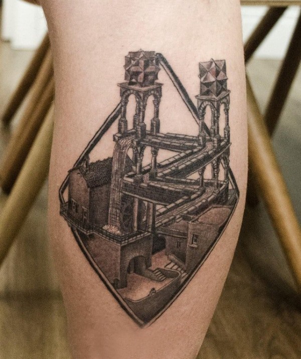 建筑物纹身 女生小腿上黑灰的建筑物纹身图片