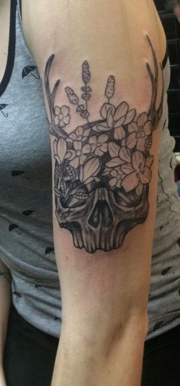 骷髅花臂纹身图片 女生手臂上花朵和骷髅纹身图片