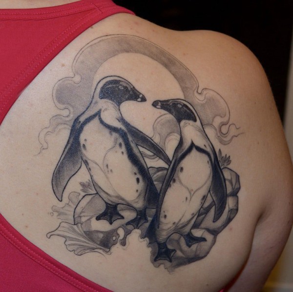 企鹅纹身图 男生后背上黑色的企鹅纹身图片