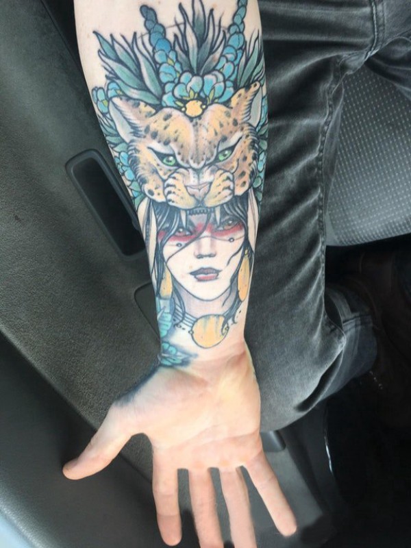 老虎和女孩纹身图案 男生小臂上老虎和女孩纹身图片