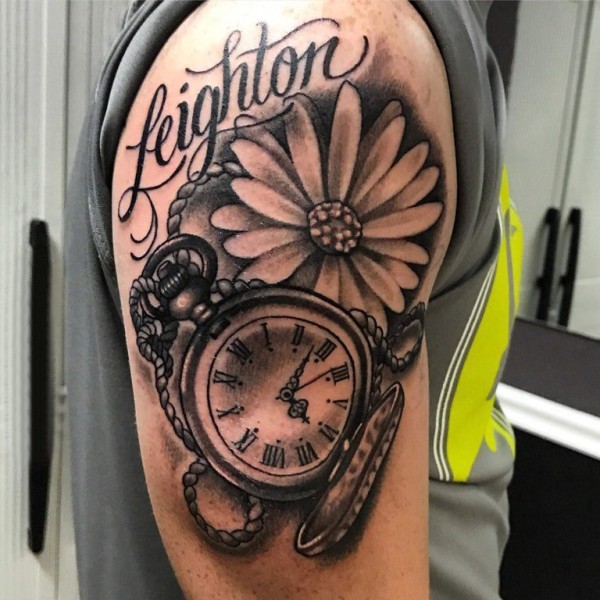 黑色极简纹身 男生大臂上花朵和时钟纹身图片