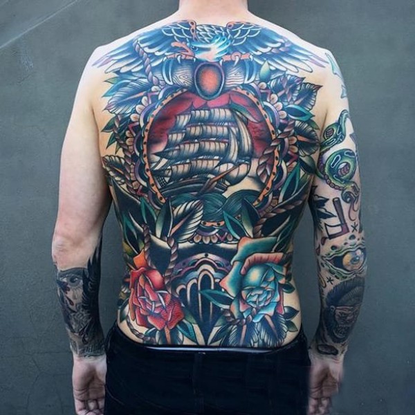 满背蝴蝶骷髅和花纹身图案