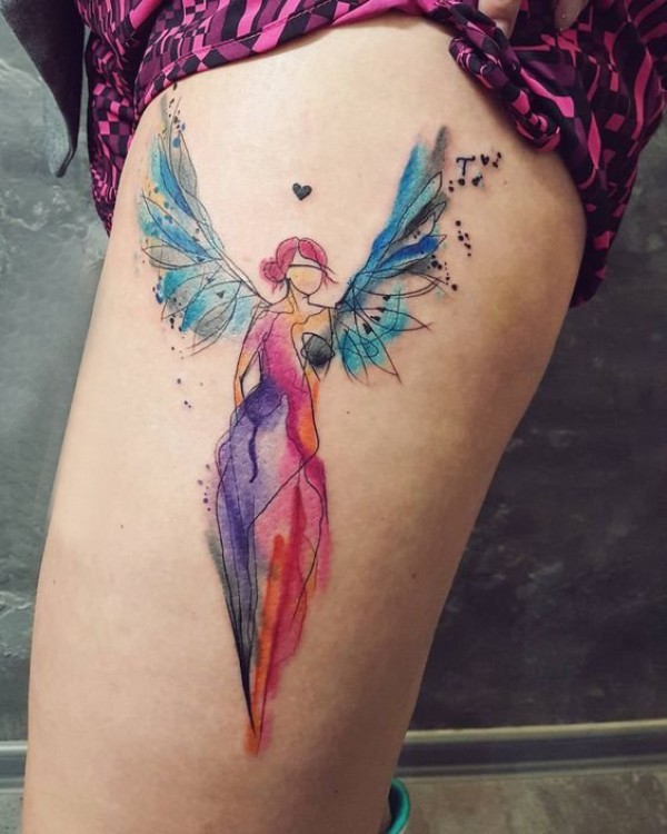 腿部黑灰天使纹身图案_天使纹身图案大全_纹身图吧