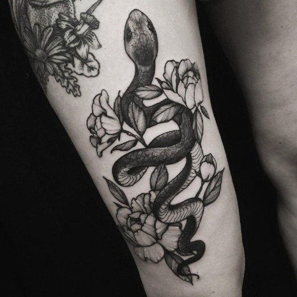 蛇和花朵纹身图案 女生大腿上蛇和花朵纹身图片