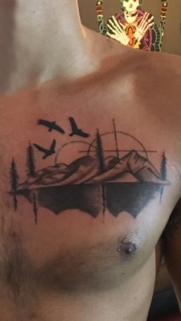 山水纹身图案 男生胸上黑灰的山水和鸟纹身图片