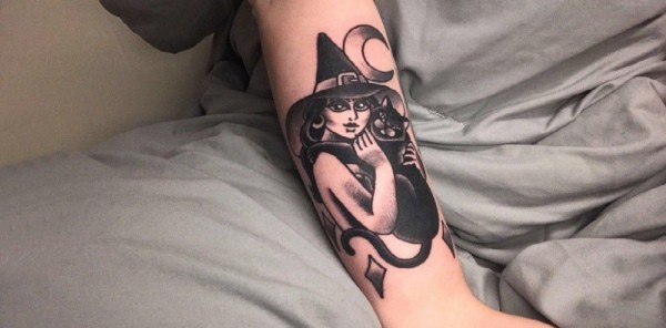 女巫纹身图案 女生手臂上女巫和猫纹身图片