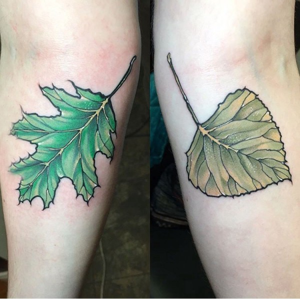 树叶纹身图 女生手臂上彩色的树叶纹身图片