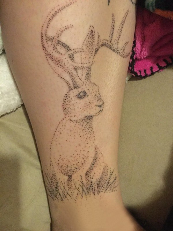 纹身点刺技巧 女生小腿上黑灰的兔子纹身图片