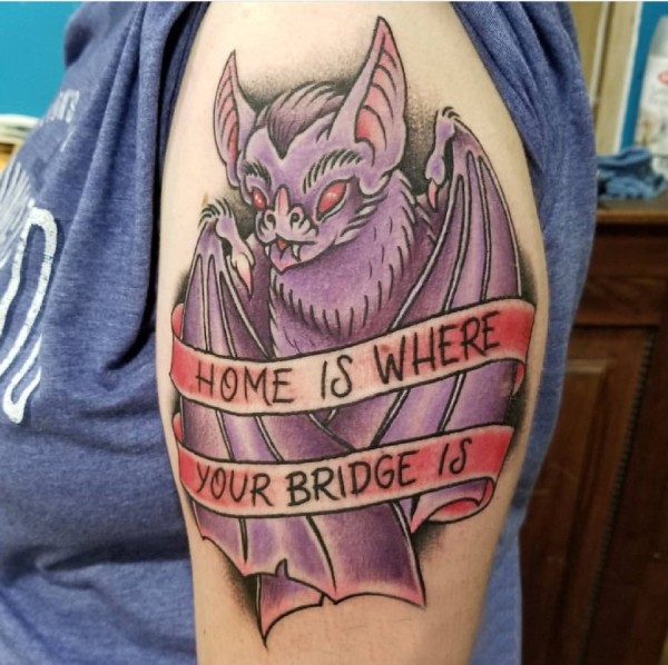 纹身蝙蝠 男生大臂上彩色的蝙蝠纹身图片