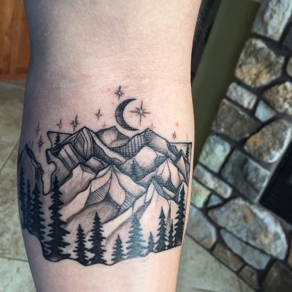 黑灰写实纹身 男生手臂上黑色的山脉纹身图片