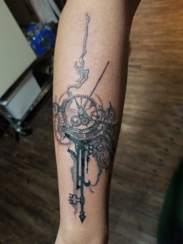 机械齿轮纹身 男生手臂上黑色齿轮纹身图片