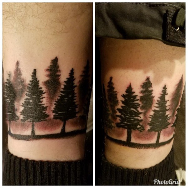 树林纹身图案 男生小腿上黑灰的树林纹身图片