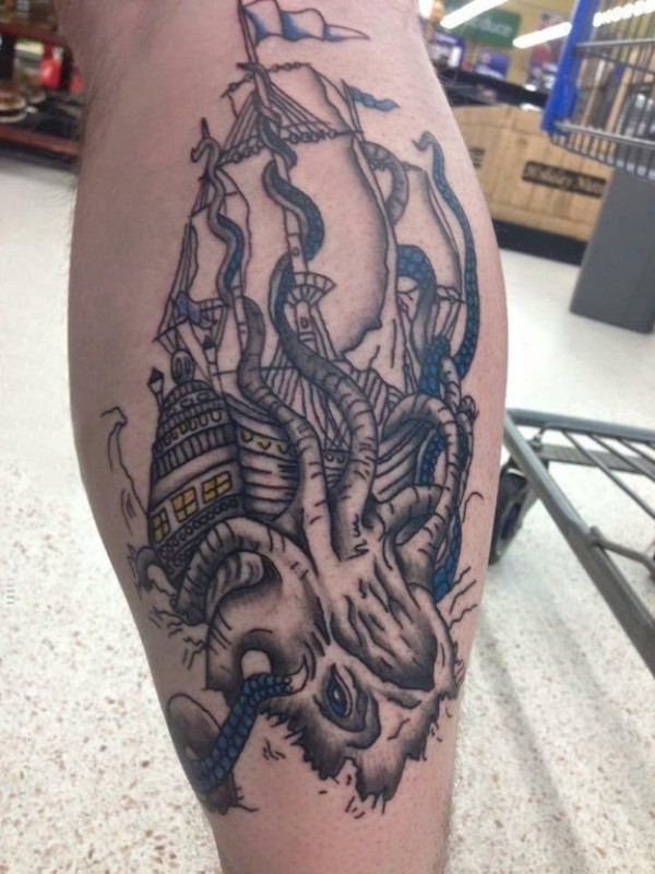 欧美小腿纹身 男生小腿上帆船和章鱼纹身图片