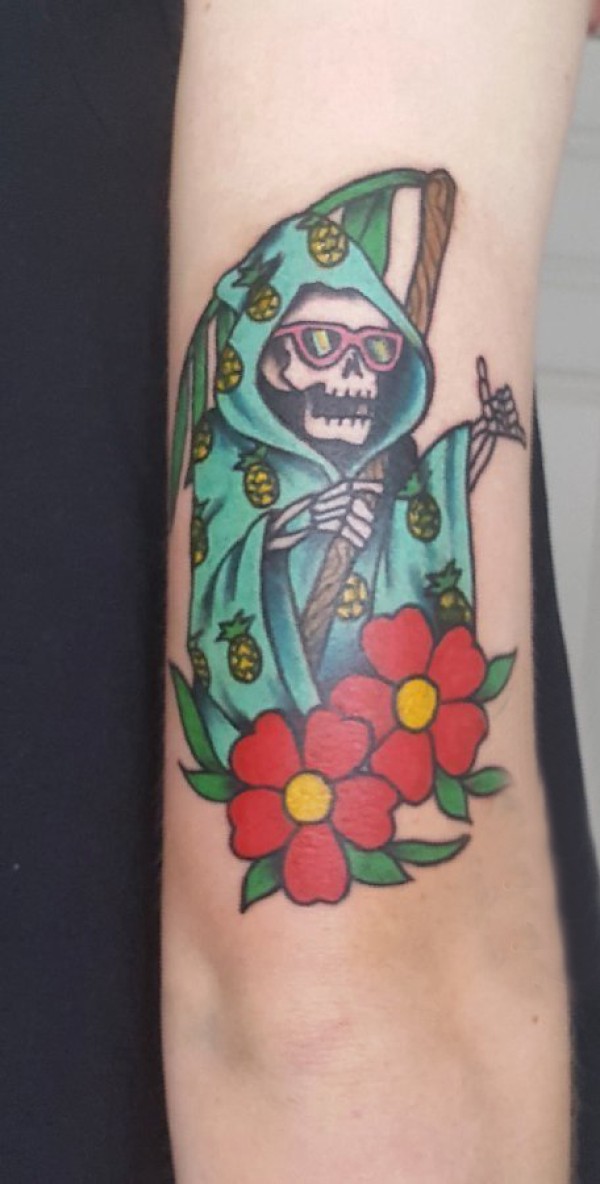 骷髅和花朵纹身图案 女生手臂上骷髅和花朵纹身图片