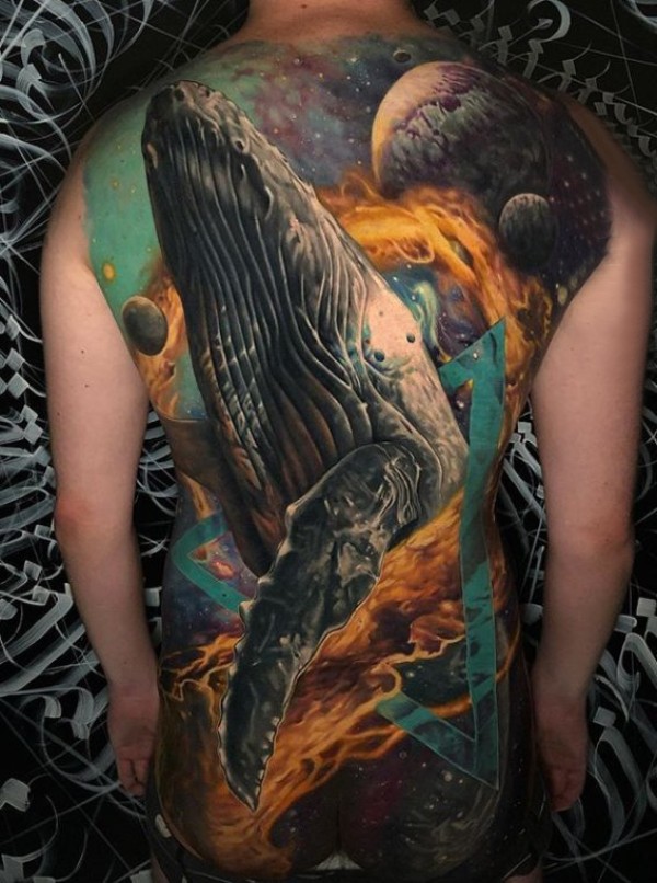后背纹身男 男生后背上星球和鲸鱼纹身图片