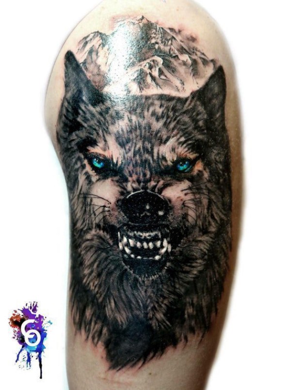滴血狼头纹身 男生大臂上彩色的狼头纹身图片