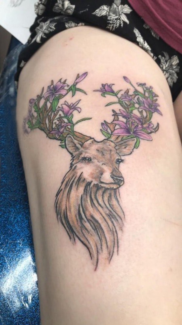 文艺鹿纹身 女生大腿上花朵和鹿纹身图片
