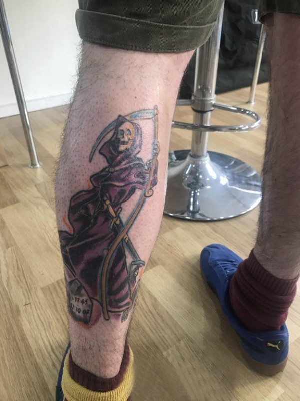 死神镰刀纹身图案 男生小腿上死神和镰刀纹身图片