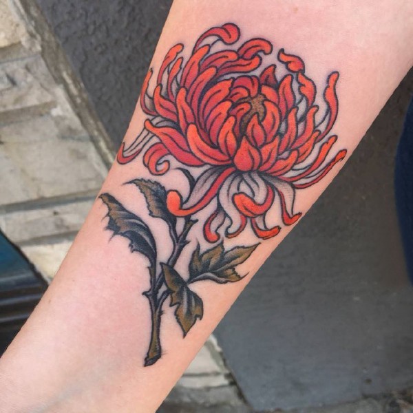 纹身菊花图案 女生手臂上彩色的菊花纹身图片