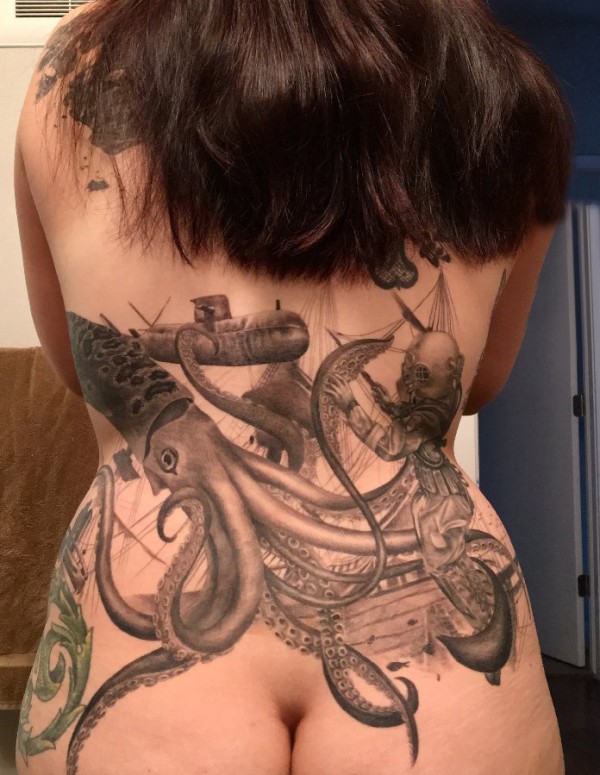 女生后腰纹身 女生后腰上帆船和章鱼纹身图片