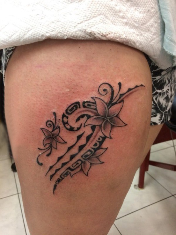 大腿纹身传统 女生大腿上黑色的花卉纹身图片