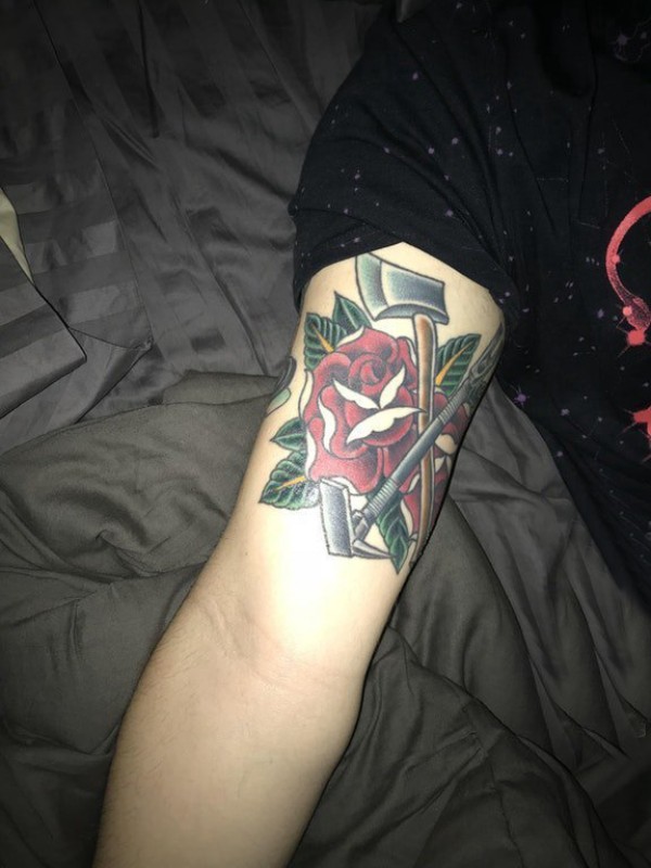玫瑰纹身图 男生手臂上斧头和玫瑰纹身图片