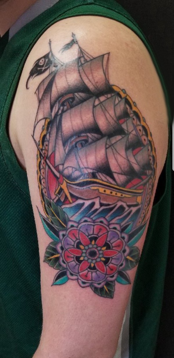 双大臂纹身 男生大臂上花朵和帆船纹身图片