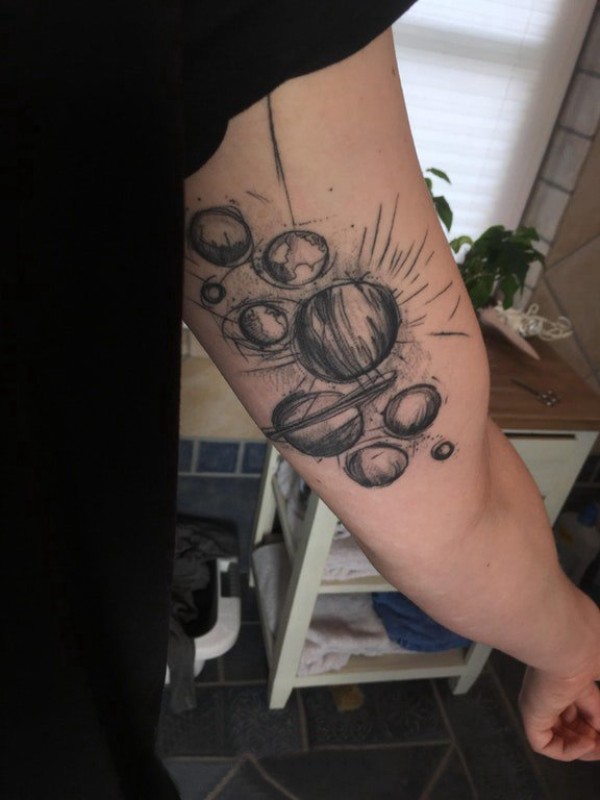 简易纹身素描 男生手臂上黑色的星球纹身图片