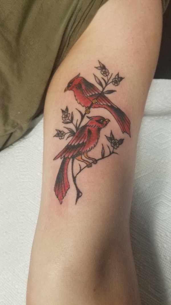 大臂纹身图 女生大臂上植物和鸟纹身图片