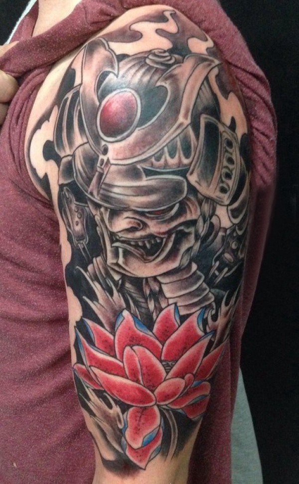 般若面具纹身 男生大臂上莲花和般若纹身图片