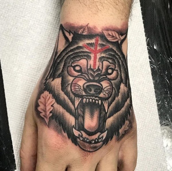 老虎头纹身图案 男生手背上彩绘的老虎头纹身图片