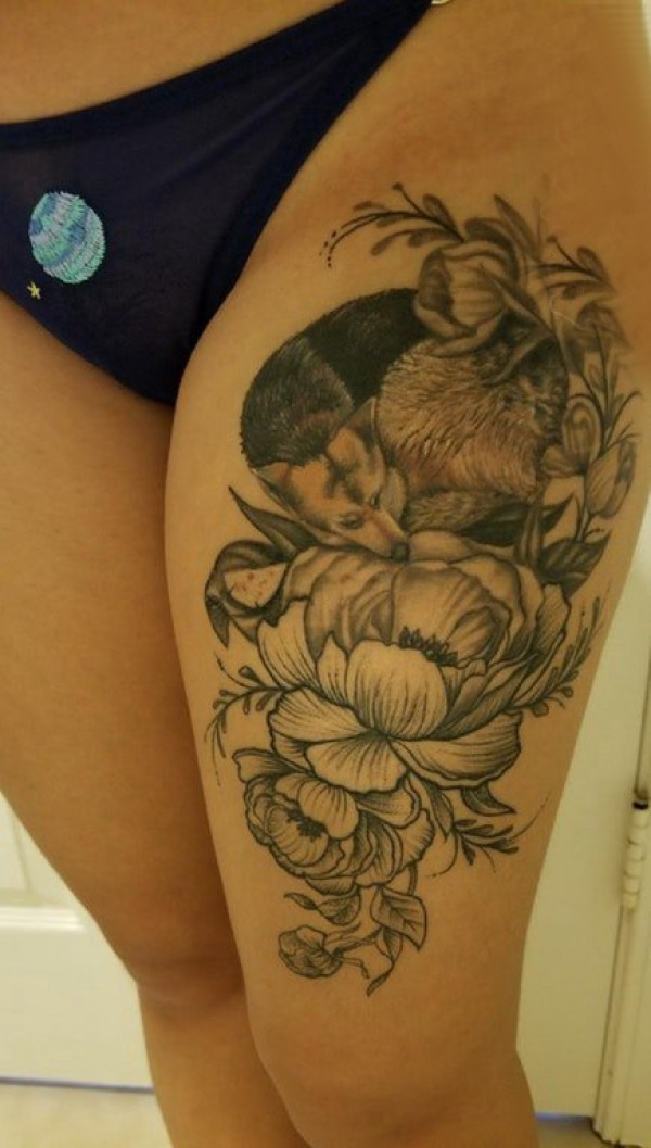 纹身图案花朵 女生大腿上狐狸和花朵纹身图片