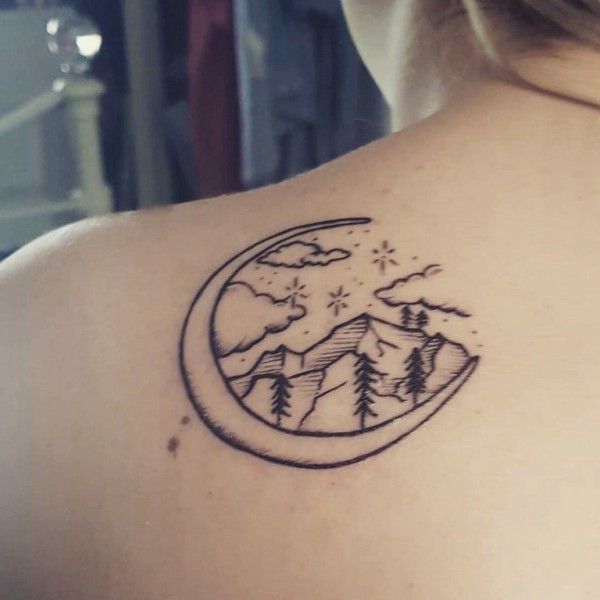 极简线条纹身 女生后背上月亮和山脉纹身图片